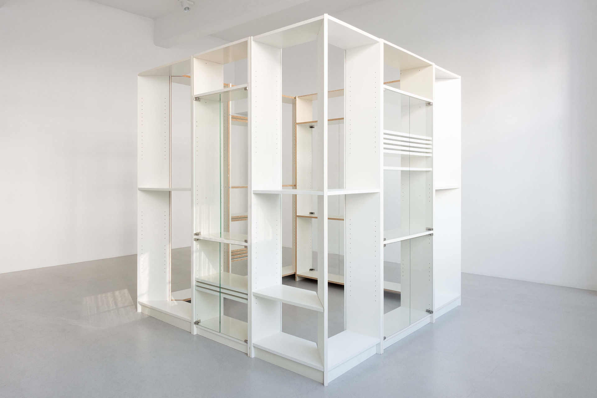 Anyway, since Index 19, Sanna and Max have bounced attempts to meet again back and forth but Sanna is based in Berlin. When searching our inboxes, Max sent Katarina an email on Mon, Apr 29, 2024, 11:12 AM saying “Vi borde visa henne Puss Max Ronnersjö” and here we are. What followed was a chain of 90+ emails and video calls arranged around our daughters’ bedtimes. Sanna writes the long ones and we reply with the short ones–now a document over the morphology of ideas that lead to the constellation made from Billy shelving units that you can witness in the main room. There is also a small coin in the wall. Before Sanna’s arrival in Stockholm, we drove around and sourced the shelves from various parts of town. They have a nice range of shades of white-going-on-yellow. Some of them–the ones with the glass doors–must be over 45 years old, Sanna says. The older ones are much sturdier than the newer ones, that are more like cardboard. The Lightbulb Conspiracy can thus be applied to shelves. One email from Sanna contains a quote from Jean Baudrillard: